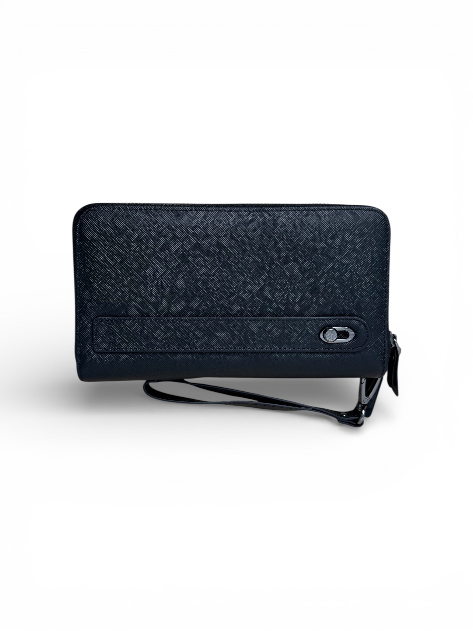 Портмоне из натуральной сафьяновой кожи с ремешком для руки и двумя молниями. Классическая организация внутри: купюры, карты, документы и мелочи.
