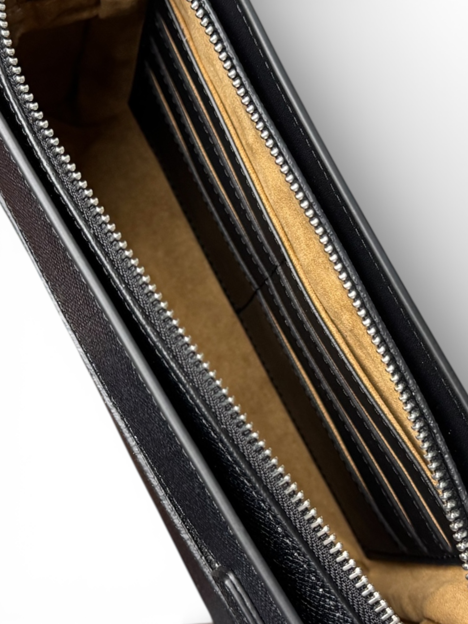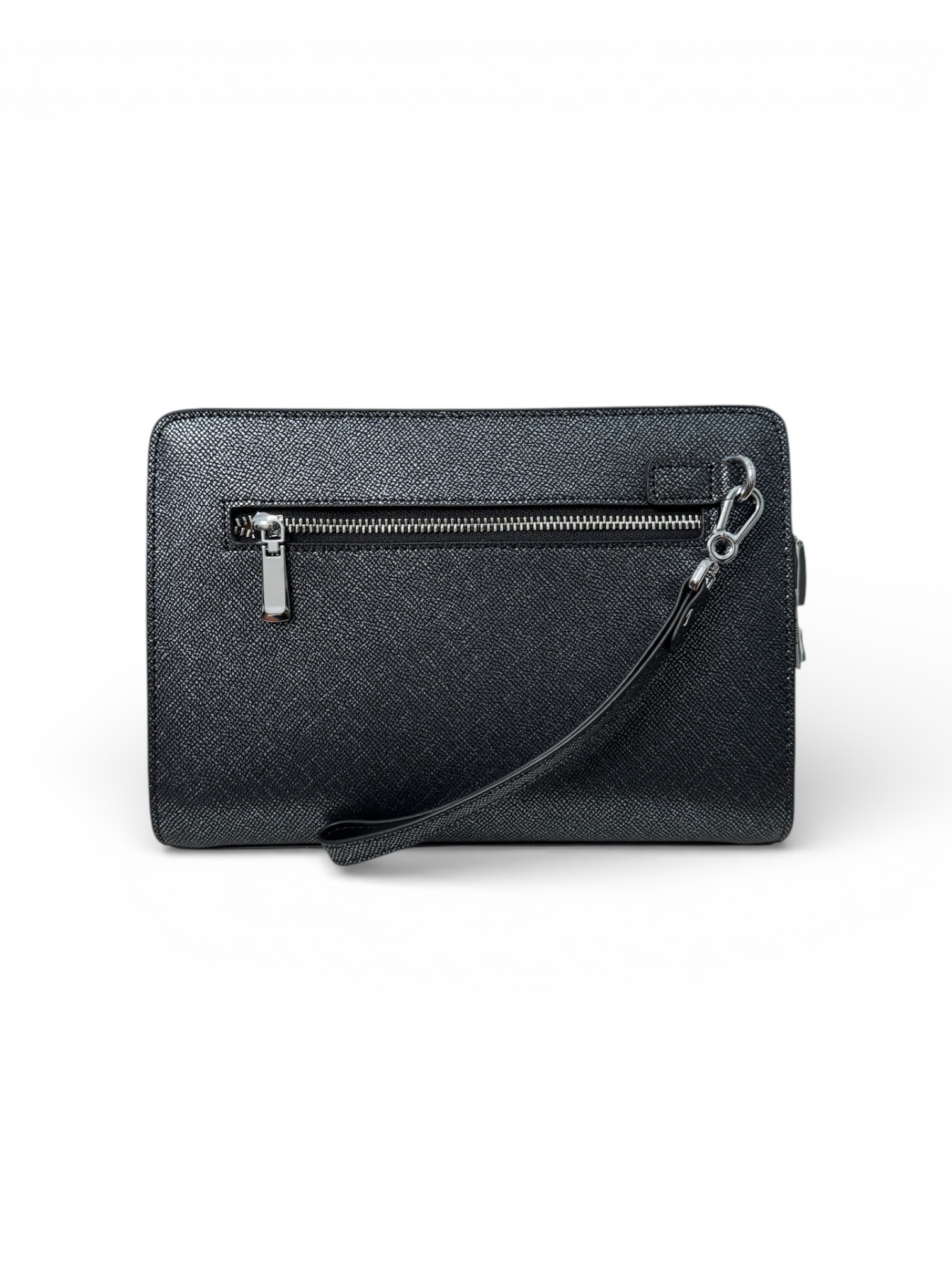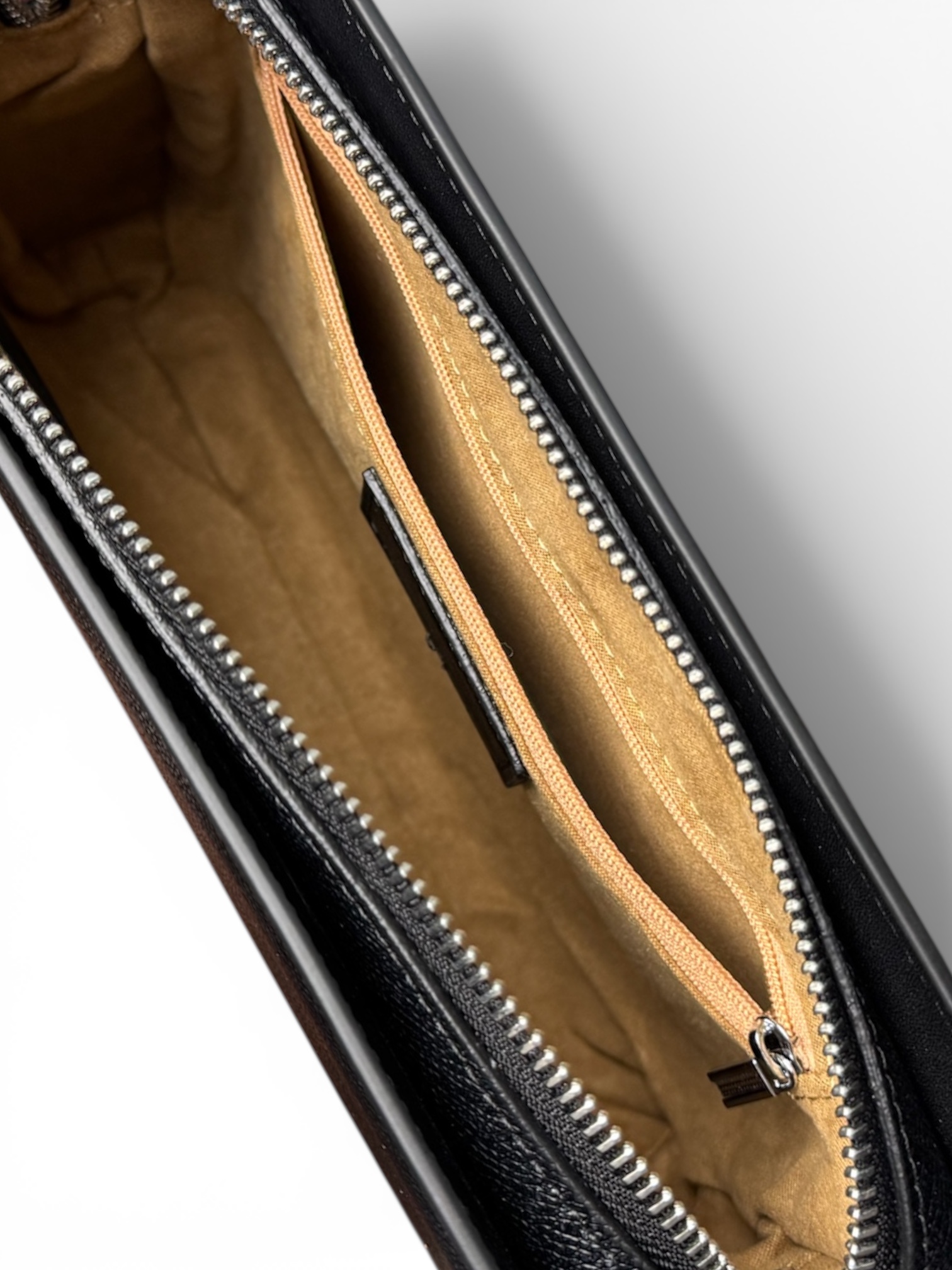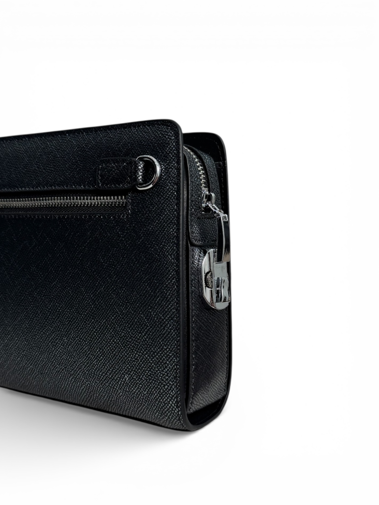 Внутренняя отделка выполнена из алькантары — мягкая, приятная на ощупь и хорошо защищает вещи внутри. Для быстрого доступа предусмотрен внешний карман на молнии — удобно положить телефон, карту, ключи или наушники. Ремешок для руки на карабине помогает комфортно носить барсетку и держать её под контролем.